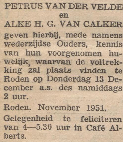 29 oktober 1950: verloving met Alke Hillechiena Geertruida van Calker uit Een, dochter van schoolhoofd Jan van Calker uit Veendam en Jantje Dinkla uit Zuidlaren. Vanwege de aanstaande verloving vinden al sollicitaties naar andere scholen plaats.