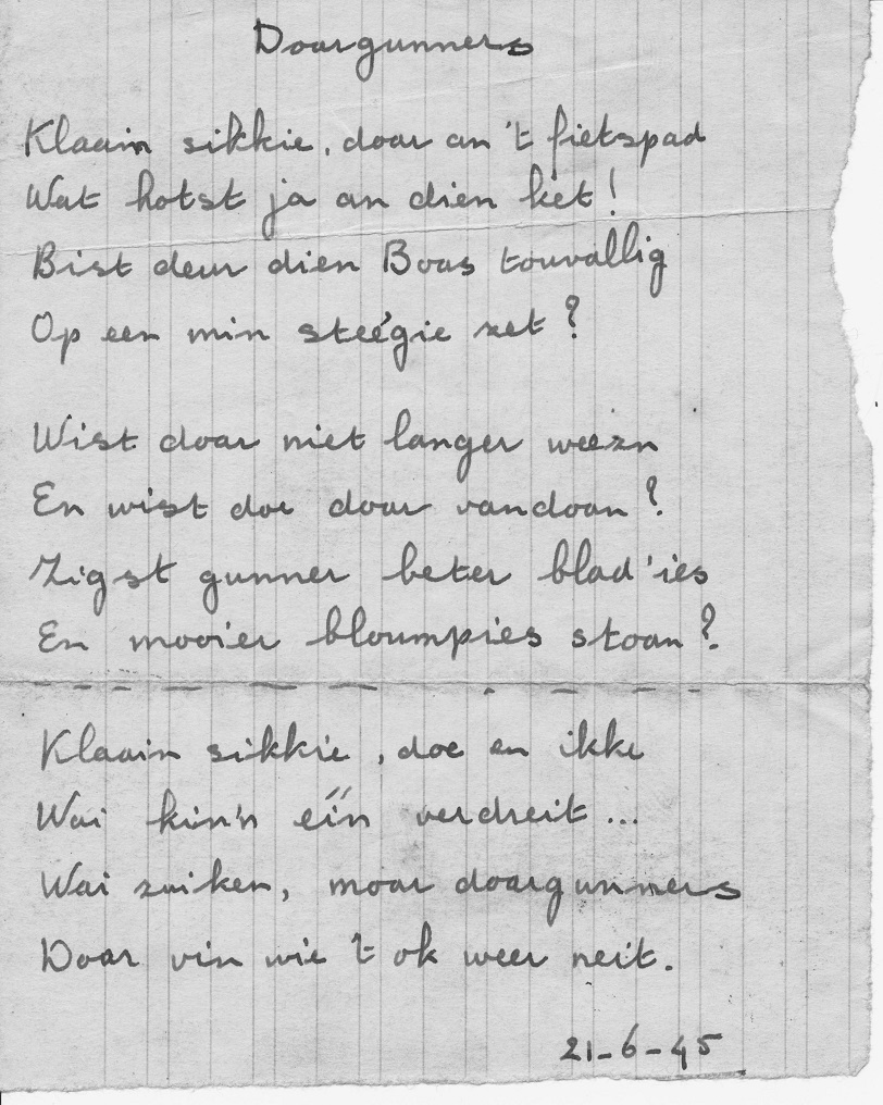 - hoewel het gedicht "Doargunners" (blz. 52) voor het eerst gepubliceerd is in 1947, bestaat er een handgeschreven versie gedateerd 21-6-1945. In plaats van "wai" in de laatste regel staat hier "wie".
